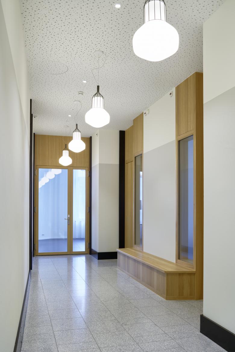 In Anlehnung an das Piano Nobile finden im ersten Obergeschoss die Hauptaktivitäten des Hauses ausserhalb der Pflegegruppen statt. Der angrenzende Saal kann je nach Bedarf dazu geschaltet werden oder bei Anlässen geschlossen werden. Im nördlichen Flügel befinden sich die Therapieräume und der Aufenthaltsraum des Personals. Nischen mit Sitzgruppen bilden wichtige Wartebereiche.