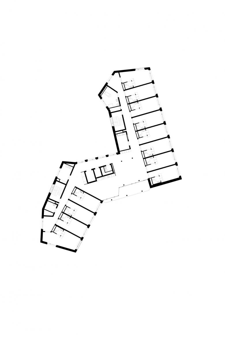 In den oberen Etagen ist auch hier der Übersichtlichkeit und Orientierung der BewohnerInnen durch die klaren räumlichen Zuordnungen grosse Beachtung geschenkt worden. Ausblicke ins Quartier, ruhige Begegnungszonen, und kurze Erschliessungsbereiche unterstützen diese Anforderungen. Die leicht konische Geometrie verkürzt optisch die Korridore und die Türnischen der Zimmer rhythmisieren die Erschliessung. Die Zimmer sind zweckmässig gestaltet und zeichnen sich vor allem durch das Panoramafenster aus.