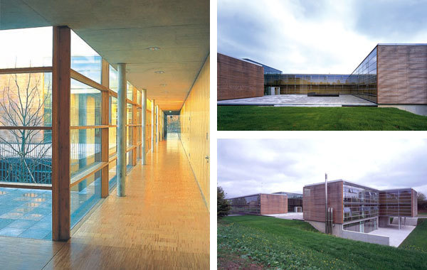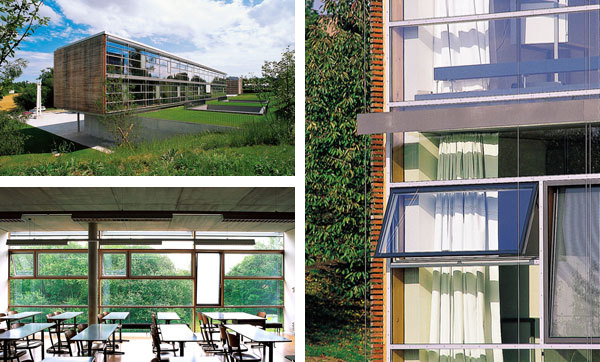Thema war möglichst ein leistungsfähiges modernes Konzept mit hohen Energie - Einsparungsmaßnahmen in allen Bereichen für die Zukunft zu finden, um die Unterhaltskosten zu reduzieren. Die gezielte Anordnung der kompakten Gebäude um eine Halle, ermöglicht effektive passive Solarenergienutzung. Der Gebäudetyp mit massivem Sichtbeton - Wand | Deckenelementen unterstützt den Gedanken. Zur elektrischen Energieeinsparung wurde eine tageslichtabhängige Lichtsteuerung über Sensoren realisiert. Eine extensive Dachbegrünung verbessert das Klima und entlastet die Kanäle.