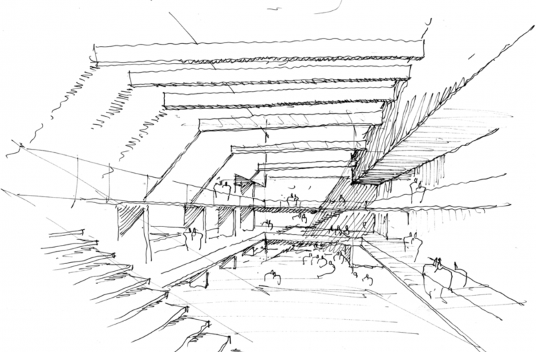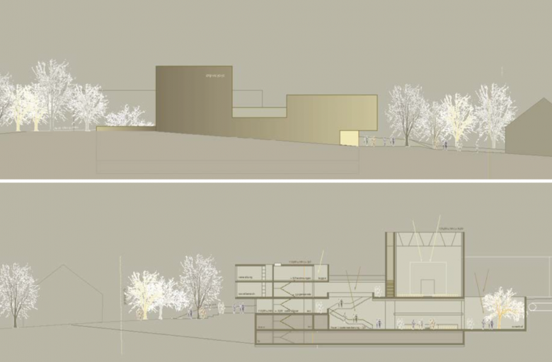 Das neue jüdische Zentrum mit Synagoge entsteht als Solitärbaukörper auf der vorhandenen Wiesenkuppe in Anlehnung an die Kulturgeschichte „des Tempels auf dem Berge Sinai“. Es symbolisiert „ein Haus“ des Austausches und der Begegnung; ein Podium für Toleranz und Dialog. Die skulpturale Ausformulierung entsteht aus dem Inneren heraus und macht die einzelnen Funktionen ablesbar - die Form erinnert an eine ausgerollte Thorarolle. Das gefaltete hölzerne Tragwerk des Daches im Kirchenraum symbolisiert den Davidstern und inszeniert den Raum auf besondere mythische Weise.