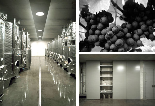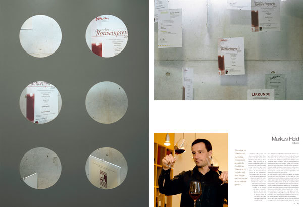 Die neuen betrieblichen Räume wurden entsprechend den funktionalen Anforderungen, auf Ihre minimalen Elemente Wand, Decke und Boden reduziert und in einer homogenen Stahlbetonoberfläche hergestellt. Alle technischen Einbauten, wie Leuchten, Rinnen und Schalter wurden frühzeitig in die Planung integriert. Die Installation der Tanks im UG zusammen mit der Gebäudetechnik und den Leuchten werden in einer abgehängten Konsole geführt und zu einem Gestaltelement zusammengefasst. Technisch hochinstallierte Bereiche wurden zu sogenannten Laboren zusammengefasst und je zentral für den betrieblichen Ablauf angeordnet. Eine flexible mehrteilige Schiebewand aus geschosshohen Stahltafeln, verschließt die Labore und fasst den Raum zu einer gestalterischen Einheit. Der neue Lastenaufzug mit Treppenanlage bildet zusammen mit einer Präsentationsnische den repräsentativen Eingang für die Kunden. Eine Präsentation der Auszeichnungen des Winzers als Installation macht neugierig und gibt Einblick in die Philosophie des Winzers.