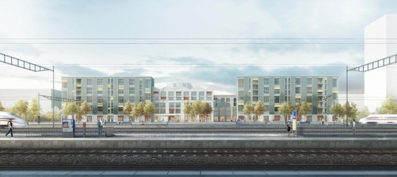 Als Tor zum Rietpark-Quartier präsentiert sich das Baufeld B3 mit seiner Grösse, der prägnanten Stellung an den Gleisen und dem direkten Anschluss an den Bahnhof. Die ortsbauliche Idee besteht aus zwei klammerartigen Randbebauungen mit atmosphärisch unterschiedlichen Hofräumen, sowie zwei Ankerhäusern, welche die Randbebauungsklammern aufbrechen und dazwischen in der Nord-Südverbindung einen Gassenknoten definieren.