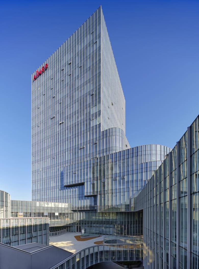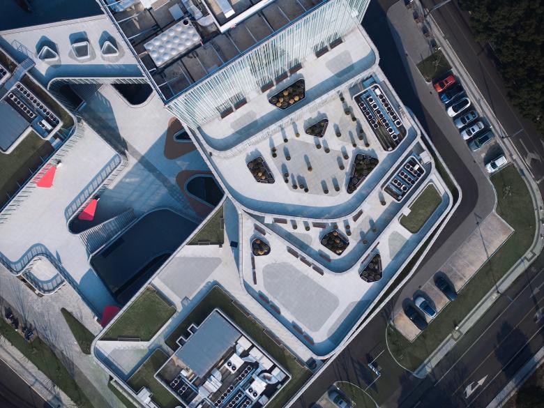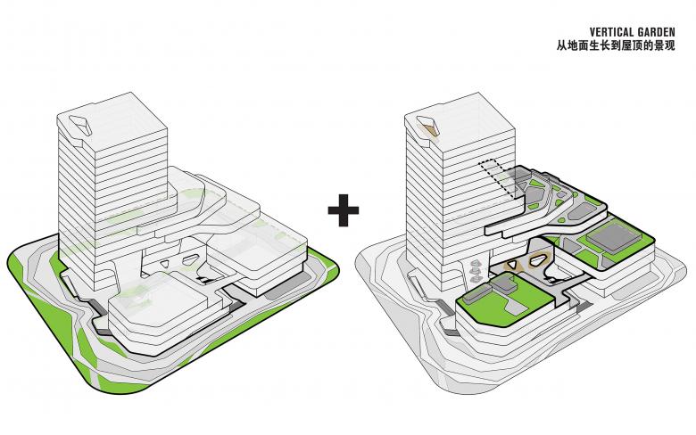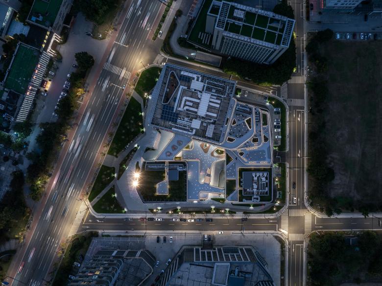 The original fragmented layout was reorganized into an integrated, multifunctional space, which enhances connectivity and program diversity. The redesigned complex consists of three interconnected volumes anchored by a 17-story tower. On the lower floors, the tower extends outward and gradually steps down into terraces, visually connecting the architecture to its surroundings.