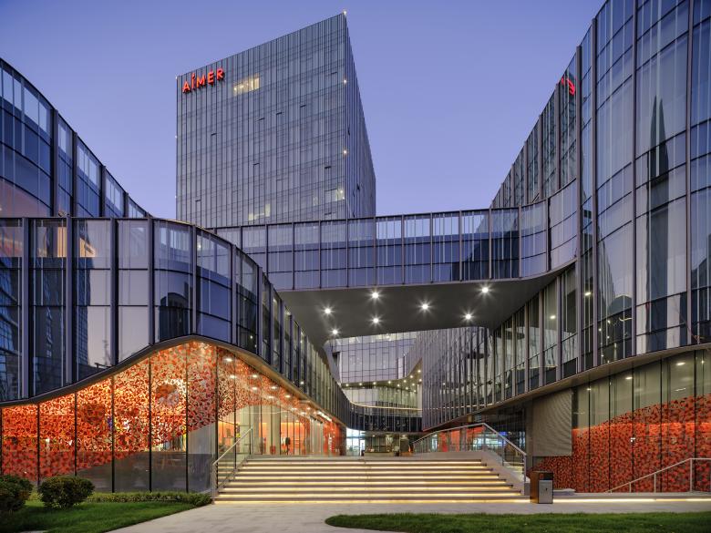 The Aimer Suzhou Headquarters integrates a diverse range of functions. The combination of Commercial areas, outlet, offices, live streaming, hotel, conference functions, multifunctional hall, and VIP reception, complete a building that caters to business travelers, shoppers, and creative professionals alike.