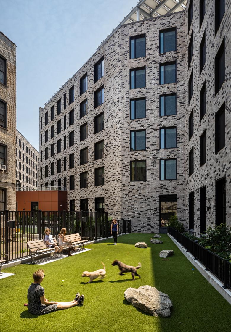 Vital Brookdale provides amenities that promote wellness and create safe spaces for its residents and the larger community. Tenants have access to a terrace, landscaped courtyards, a dog run, play area, and passive recreation and seating areas. Additional amenities include a community room, game room, library/co-working space, fitness room, laundry room, and a bike storage room. The design of Vital Brookdale provides visual and physical connections between active and passive outdoor spaces, the interior common areas, and many of the units.