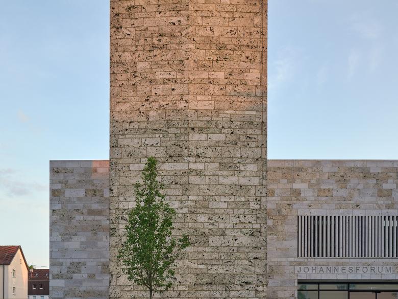 Die rund 60 Jahre alte Natursteinfassade der Johanneskirche aus Gönninger Kalktuffstein wurde vorsichtig rückgebaut, gereinigt, eingelagert und einer Materialprüfung unterzogen. So konnten fast 300 qm der vorhandenen Steine in der neuen Fassade des Johannesforums weiterverwendet werden. Gemischt mit lokal vorkommenden Gauinger Travertin sind die ursprünglichen Steine jetzt ein natürlicher Teil der neuen Fassade am Gemeindezentrum und stellen den Bezug zur ehemaligen Kirche her.
