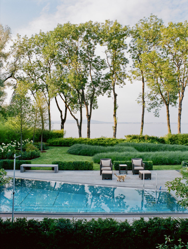 Ausgangspunkt für diesen Garten war eine Verschmelzung von Aussen- und Innenwelt zu schaffen und eine Verbindung der verschiedenen Gartenetagen herzustellen, um ein architektonisches Zusammenspiel von Haus und Gelände zu erreichen. Durch das Verbindungselement einer Holz- und Glasbrücke wurde der Wohnraum subtil mit dem Garten und dem See verbunden. Die Kombination von Gräserkissen mit Alpenrosen in Form einer Welle gepflanzt, nehmen die Bewegung des Wassers auf. Die Amelanchien im unteren Gartengeschoss reichen mit Ihrer Krone über den Wohnraum hinaus und bilden einen fliessenden Übergang zum Garten. Durch ein rotes Tulpenbeet führt ein Kiesweg zum Tee- und Gewürzgarten am Seeufer. Den Rahmen des Gartens bildet eine dicht bepflanzte Bambushecke, Taxodium, Gräser und Hortensien werden als weitere Elemente im Garten integriert. Direkt am Ufer bilden die schlanken, hoch geschnittenen Eschen einen transparenten Abschluss und lassen trotzdem den Blick auf den See frei.