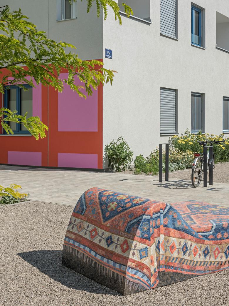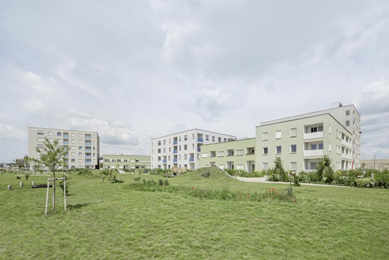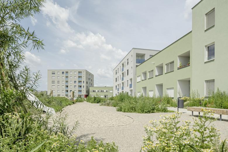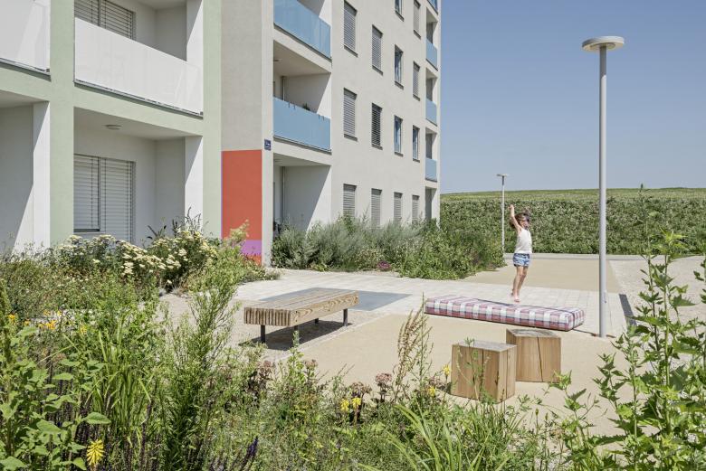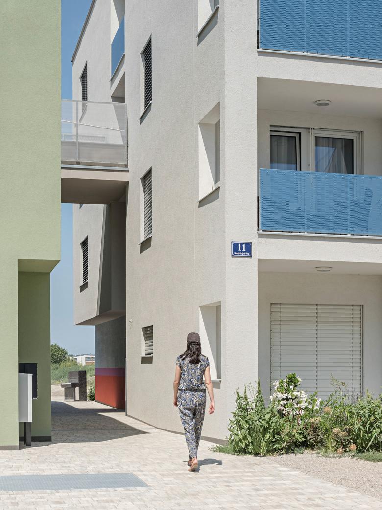 Acht klare Baukörper mit unterschiedlichen Höhen bilden eine kleinteilige Struktur. Offene Durchgänge zwischen den Gebäuden schaffen eine Verbindung zur Nachbarschaft. Das vielfältige Wohnangebot für unterschiedliche Lebensformen und Generationen wird durch die Integration sozialer Nutzungen erweitert (betreutes Wohnen für junge Menschen mit Behinderung und Wohnungen der Wiener Frauenhäuser). Zwei Gemeinschaftsräume, drei Dachgärten, künstlerisch gestaltete Passagen sowie großzügige Freiräume stärken das nachbarschaftliche Miteinander. Die modulare Bauweise ermöglicht Grundrissflexibilität bei sich ständig ändernden Wohnbedürfnissen. Die Energieversorgung erfolgt gänzlich über erneuerbare, klimafreundliche Energiequellen.