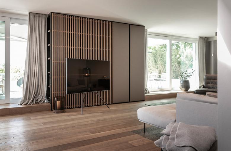 Weiße Wände sucht man in der Ulmer Wohnung vergebens. Dafür empfängt ihre Bewohner ein harmonisches Farbkonzept aus warmen Grau- und Naturtönen. Schwarze Akzente geben den Räumen Tiefe und führen das Auge – vom gerahmten Spiegel im Eingangsbereich, der den Flur weit wirken lässt, über den offenen Wohnbereich mit seinem Esstisch aus schwarzen Marmor und den clever versteckten Einbaunischen als Hausbar, durch den schmalen Flur bis in den kombinierten Schlaf- und Ankleidebereich.