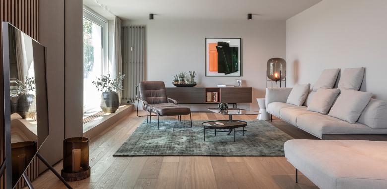 Ein Schallschutz verstärkt das 70er-Jahre Haus und hält Umgebungslärm fern, die Materialien sind ein Mix aus Eichenholz, Naturstein, Leinen, Leder und metallischen Lackierungen und ziehen sich in Nuancen warmer Naturtöne wie ein roter Faden durch die Wohnung. Bis ins kleinste Detail sind Grundriss, Möbel, Dekoration, sogar Vorhänge und Kunst aufeinander abgestimmt und dennoch fügt sich alles lässig, unprätentiös, fast wie zufällig zueinander. Die Dachterrasse vor den bodentiefen Fenstern im Wohn-/Essbereich ist der vielleicht einzige Grund, die Komfortzone ab und an zu verlassen.