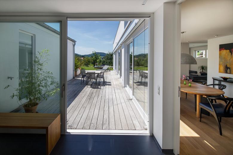 Betritt man das Haus durch die geschlossen wirkende Fassadenfront, öffnet sich dahinter schon der Blick auf Terrasse, Garten und Natur. Von hier aus erschließt sich dem Besucher der Grundriss. Zwischen zwei Flügeln liegt der Patio, verbindendes Element der beiden Flügel und introvertierter Terrassenbereich.