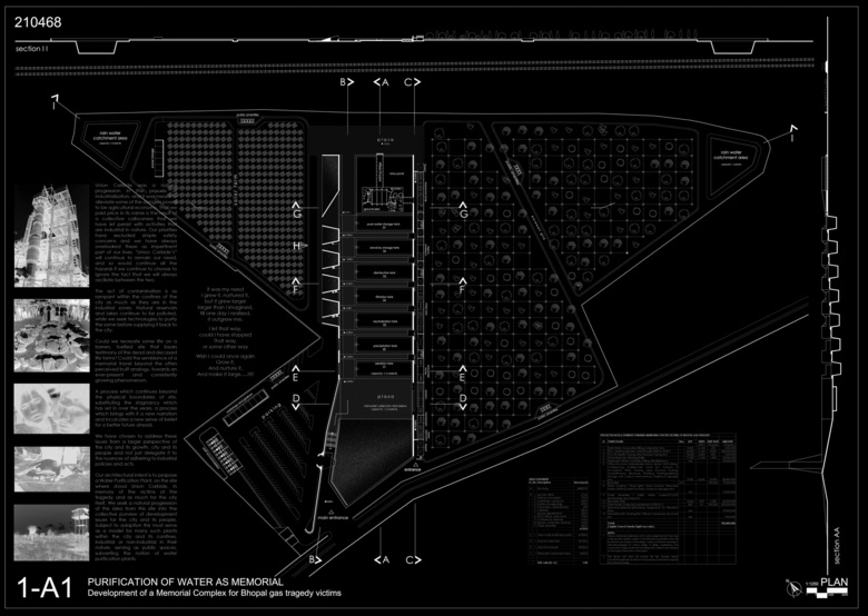 Our architectural intent is to propose a Water Purification Plant, on the site where stood Union Carbide, in memory of the victims of the tragedy and as much for the city itself. We seek a natural progression of this idea from this site into the collective purview of development issues for the city and its people. Subject to adaption this must serve as a model for many such plants within the city and its confines, industrial or non industrial in their nature, serving as public spaces, subverting the notion of water purification plants.