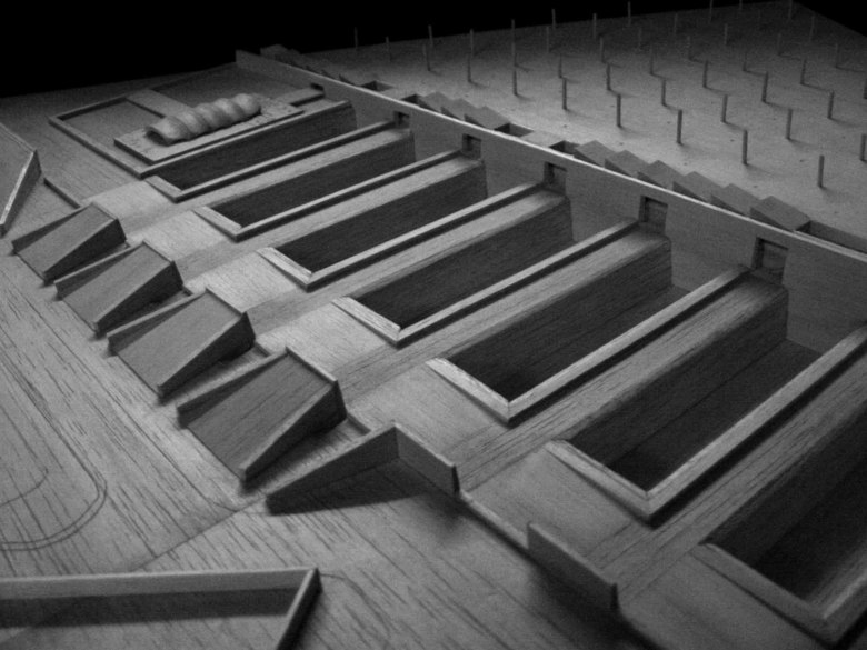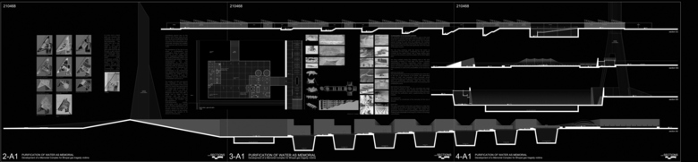 Considering ground zero as the highest level, these tanks are set into the ground progressively rising from the lowermost contaminated tank to the uppermost tank of decontaminated tank, eventually encircling the pavillion at ground zero with a mass of pure water.