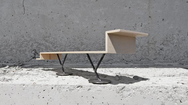 Der Tisch besteht aus zwei Grundelemente: Eine gefaltete Holzplatte sowie Y-Stützen aus unbehandelten geschweißten Metall. Die großen runden Fußplatten nehmen die Drehmomente des Tisches auf. Die Y-Stützen reduzieren die Spannweite der Tischplatte.
