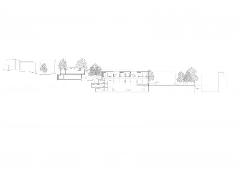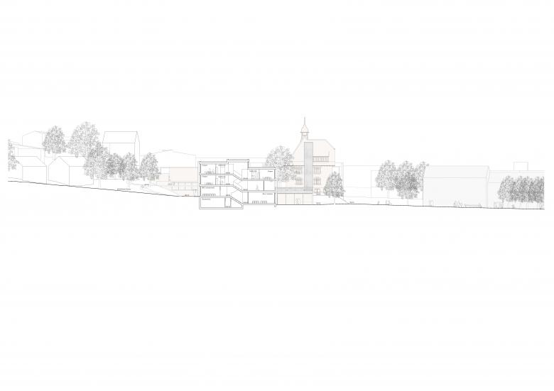 Die bestehende Primarschulanlage wird geprägt das denkmalgeschützte Schulhaus Hämisgarten im Heimatstil von 1907 welches als Solitär im Obstgarten konzipiert wurde, sowie das schutzwürdige Schulhaus Talholz (1958-61) der Basler Architekten Raser & Vadi, welches den Einzug der Moderne im Bauerndorf repräsentiert. Die beiden Gebäude stellen zwei für die jeweilige Baukultur im Schulhausbaus typologisch und gestalterisch herausragende Beispiele dar, welche sich souverän in den landschaftlichen Kontext und der Topografie einbetten. Trotz der typologischen und formalen Unterschiedlichkeit und deren Solitärcharakteristik gelingt es Raser & Vadi, mit der Einführung einer baulichen Plattform, ein in der Topografie eingebettete identitätsstiftendes Schulensembles. Die beiden neuen Baukörper flankieren die Bestandsbauten. Das geforderte Raumprogramm wird in zwei kompakte Baukörper organisiert. Durch das Versammeln der fünf Gebäude um das zentrale Schulplateau entsteht ein erkennbares, zusammenhängendes Schulareal mit differenzierten Aussenräumen und Adressen. Im Gegensatz zum Bestand werden die Neubauten als flexible, wandelbares Raumgitter konzipiert. Die beiden Neubauten verweisen mit Ihrer Schnitttypologie betreffend Raumbelichtung und Belüftung auf die für den Schulbau der Nachkriegsmoderne in der Schweiz typischen zweiseitig belichteten, zweibündige Korridortypus, wie ihn exemplarisch das Talholzschulhaus repräsentiert. Das Betreuungshaus stellt eine horizontale addierte Form des Typus dar. Dem neuen Schulgebäude dagegen gelingt mit der Einführung des Splittlevels um die zentrale Halle eine vertikale Adaption des Prinzips. Die typologische Grundstruktur der neuen Gebäudes ermöglicht altersgerechte wandelnbare Unterrichtsformen vom klassischen Frontalunterricht in der Kerngruppe, bis zum klassenübergreifenden Arbeiten in der offenen Lernlandschaft. Alt und Neubauten treten in einen respektvollen Dialog und werden zu einem zusammenhängendes Schulensemble geformt.