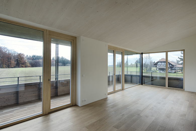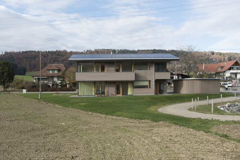 Ausgangssituation: Das bestehende Wohnhaus an der Staatsstrasse war in einem baufälligen Zustand. Die Frage stellte sich ob man es umbauen sollte oder ob das Gebäude einem Ersatzneubau weichen soll. Das bestehende Gebäude wurde als "erhaltenswert" eingestuft. Man entschied sich für einen Ersatzneubau. Die Auflage der Behörden war, dass das neue Gebäude einen landwirtschaftlichen Charakter wiederspiegeln sollte. Das neue Gebäude ist ein zweigeschossiger Holzbau, an welchem der Baustoff Holz zelebriert wird.