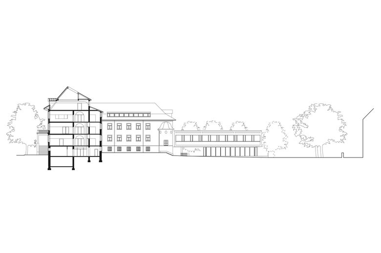 Die Fassade ist mit besonderem Augenmerk auf die denkmalpflegerischen Aspekte behutsam instandgesetzt worden. Alle unpassenden Fassadenelemente wurden entfernt. Die neuen Gestaltungselemente ergänzen den Bau im Sinne des ursprünglichen Bestandes. Auf eine nachträgliche Dämmung der Fassaden konnte aus Rücksicht auf die hochwertige Altbausubstanz verzichtet werden, da der Dachboden und die erdberührenden Böden nachträglich gedämmt worden sind. Die bestehenden Metallfenster sind durch gut gedämmte Holzfenster mit äusseren gekitteten Gläsern ausgetauscht worden. Der Ersatz der Rafflamellenstoren erfolgte durch filigrane Stoffmarkisen. Die beschädigten Sandstein- und Putzpartien (Kellenwurf) mussten nur punktuell restauriert werden. Die gesamte Farbgestaltung wurde nach den Originalfarben gehalten. Bei Elementen ohne erhaltenen Grundlagen erfolgte eine Interpretation in Rücksprache mit der Denkmalpflege. Die innere Tragstruktur musste erdbebenertüchtigt werden. Sämtliche Brandschutz- und Sicherheitsmängel sind behoben worden.