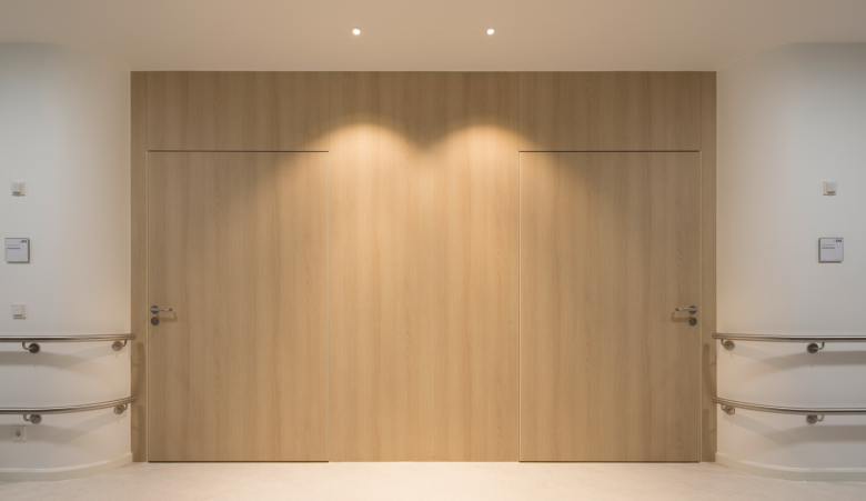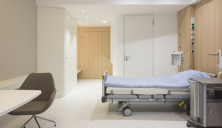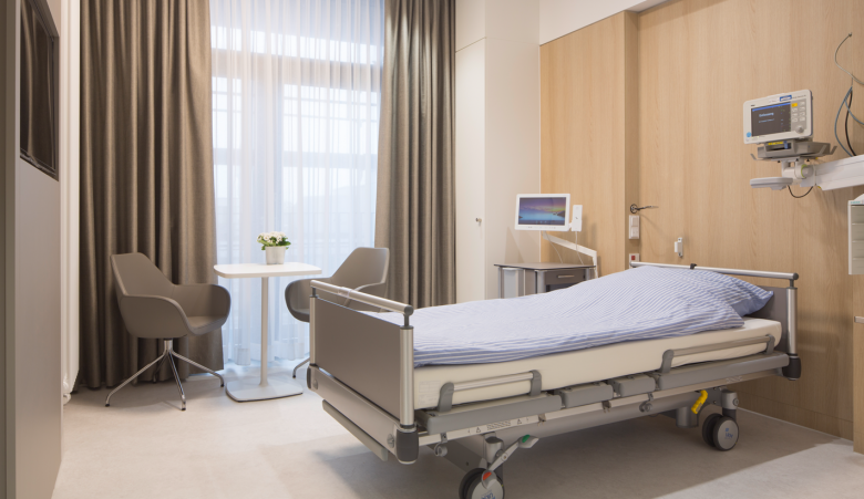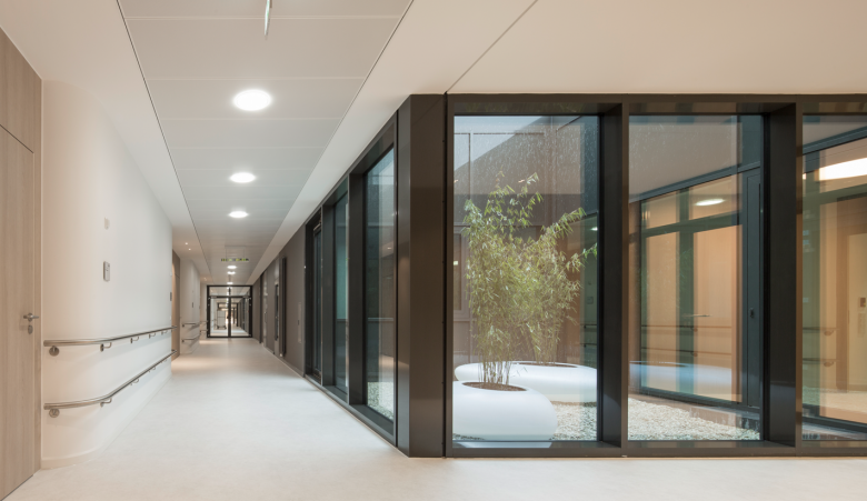 Neu geschaffene Lichthöfe in den Fluren geben den Blick frei in den Himmel und Minigärten. Die Rechtwinkligkeit üblicher Kubaturen wird durch die Innen-Architektur gebrochen. Architektur trifft Natur. Sympathische Rundungen aus Holz und interessante Lichtgestaltung prägen den Eindruck. Der vom Innenarchitekten entwickelte, sandfarbene Bio-Boden wirkt wie vom Winde umfächelt. Kissenartige Holzelemente weisen den Weg zu den Patienten-Zimmer. Auch die Zimmer sind gleichermaßen funktional, wie edel-minimalistisch.