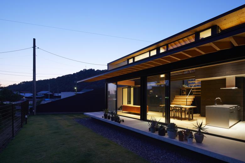 The Yawata River can be seen from the house, but because of the heavy traffic, a wall has been erected. By cutting the wall at an angle, an intermediate area between “open” and “closed” has been created, allowing the view and sound of the river to be enjoyed even when the area is closed. Furthermore, the slope of the wall, which is in line with the roof, creates an integrated connection with the building and harmonizes with the mountains in the distance.