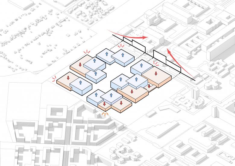 Die Neubauten, die in drei Bauphasen zu einem Gesamtkomplex zusammenwachsen, bilden ein Ensemble mit gemeinsamer Mitte, dem Klinikplatz. Sie öffnen sich über Durchgänge und Grünstreifen mit Parkcharakter nach allen Seiten zu den umliegenden Stadtvierteln.