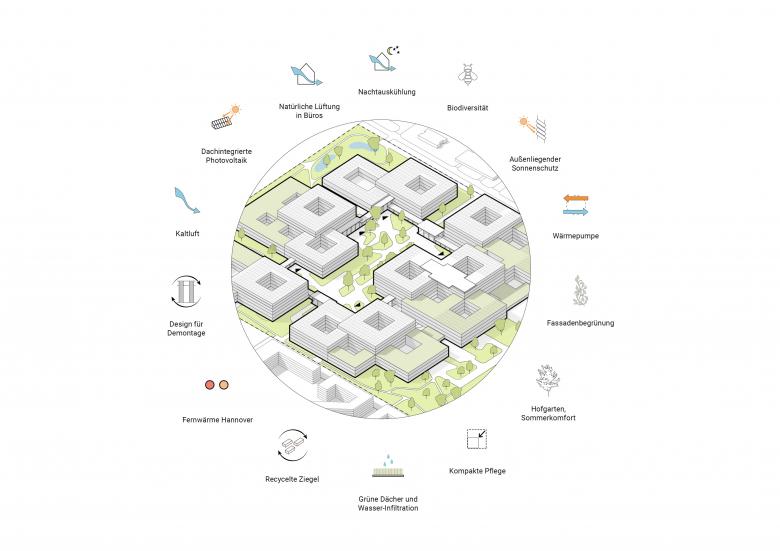 Zum urbanen Klinikplatz hin sieht der Entwurf eine helle Fassade aus recyceltem Aluminium vor, nach außen nimmt die Fassade mit einer warmen roten Färbung einen natürlichen Charakter an. Entlang des Loops verbindet ein Sockel aus wiederverwendeten Ziegeln alle Gebäude. Neben der Verwendung recycelter Materialien, der Entsiegelung von Flächen und der Förderung der Biodiversität sind kompakt geplante Gebäude und der Einsatz einer Holzhybrid-Bauweise in den oberen Geschossen, in denen die Pflegebereiche untergebracht sind, weitere wichtige Bausteine des Nachhaltigkeitskonzepts.