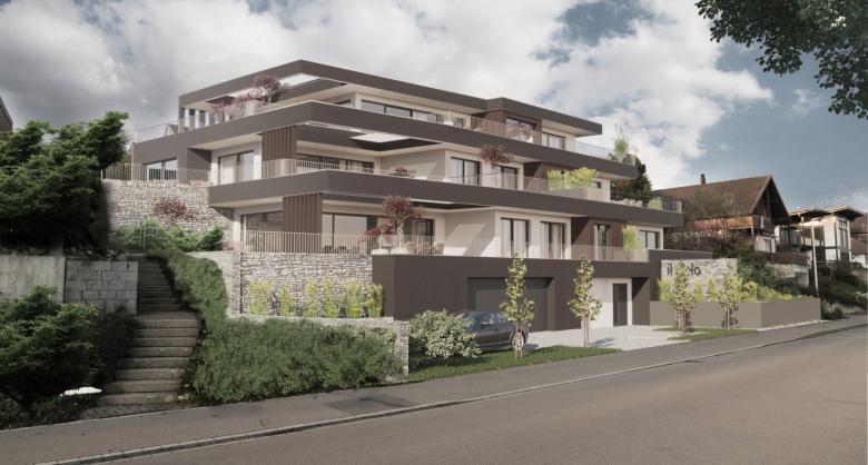 Mit seinem klar strukturierten und schlichten Erscheinungsbild fügt sich das Mehrfamilienhaus mit vier Einheiten dezent in die bestehende Situation mit diversen Baustilen ein. Die drei Wohngeschosse sind der Topografie entsprechend hangseitig gleichmässig gestaffelt, was jeder Wohnung äusserst grosszügige nach Süden orientierte Terrassen ermöglicht. Die eleganten Vordächer schützen nicht nur die Fassaden sondern unterstreichen die horizontale feine Struktur und geben dem Gebäude seine Leichtigkeit. Die grossen mit einer Markise ausgestatteten Öffnungen in den Vordächern lassen ausreichend Licht in die angrenzenden Wohnräume und bieten zugleich einen geschützten Aussenbereich. Die Unterniveaugarage mit neun Einstellplätzen liegt auf der Höhe des Strassen-Niveau und ermöglicht über das Treppenhaus mit Lift einen direkten und bequemen Zugang zu den Wohnungen.