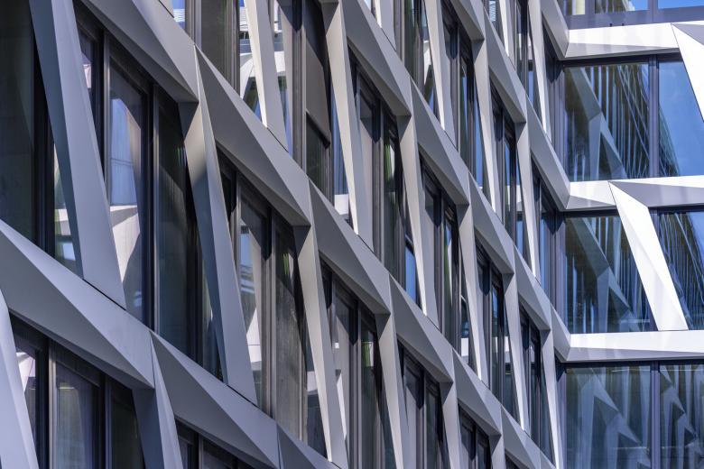 Die zweigeschossige Anhebung der Gebäudeecken öffnet das ONE PLAZA zu allen Seiten. Es ergeben sich drei großzügige Eingangssituationen, welche die Erdgeschosszone mit dem Quartier vernetzen. Gleichzeitig entsteht durch den Höhenversatz im oberen Fassadenbereich eine spannungsvoll geformte Dachlandschaft mit windgeschützten Gärten für die Büromieter. „Die schräg zulaufende Vorhangfassade mit ihren vertikalen, geschickt gefalteten Aluminium-Paneelen unterstützt die Dynamik und Leichtigkeit des Gesamtgebäudes und erzeugt ein spannungsvolles Spiel aus Licht und Schatten“, erläutert Volker Weuthen, projektverantwortlicher HPP Senior Partner.