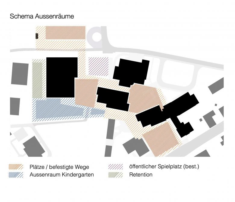 Dank der Setzung des Gebäudevolumens wird im Süden ein grosszügiger Aussenraum freigespielt, der den Kindergartenklassen zugeordnet wird. Der separate Zugang mit der zugehörigen Durchwegung trägt zur Eigenständigkeit des Aussenraums der Kindergärten bei und entspricht somit den betrieblichen Anforderungen. Hier entstehen die gewünschten «Gärten für kleinere Kinder» für einen sorglosen Pausenbetrieb mit guter Übersicht für die Betreuenden.