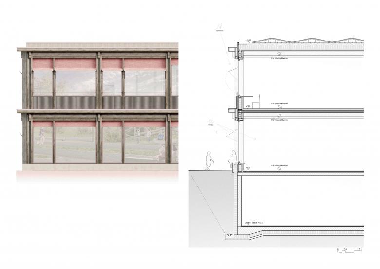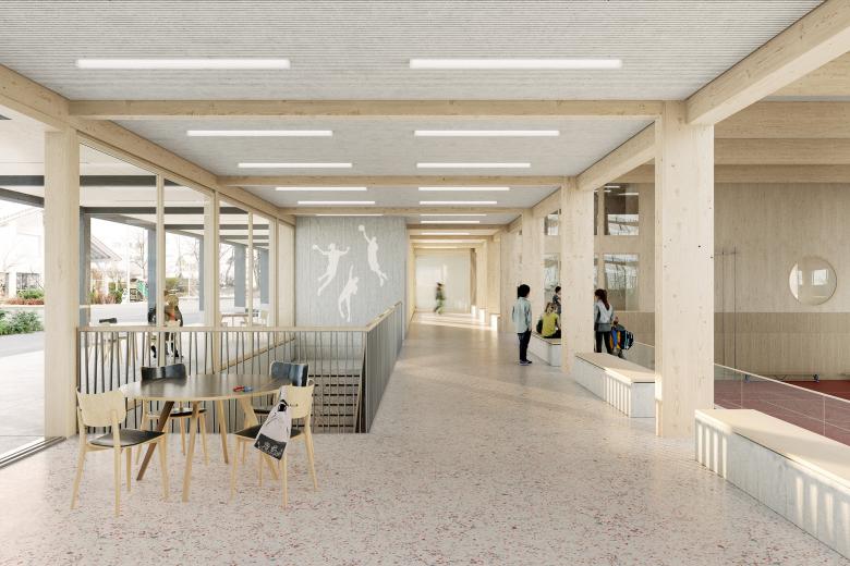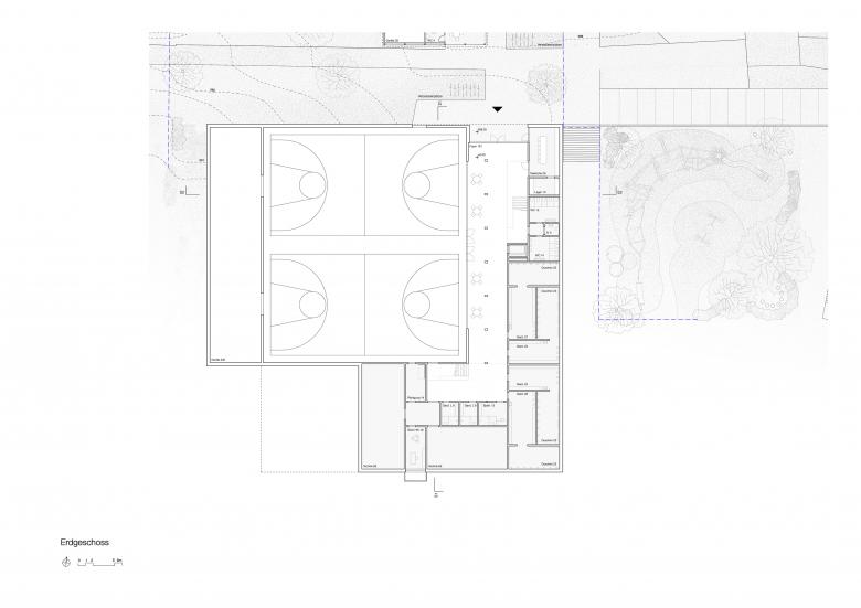 Sowohl die Adressierung der Doppelsporthalle als auch der Schulerweiterung erfolgt mit einer klaren Geste. Auf der Schulebene liegt der Haupteingang zu den Schulnutzungen an einem für die Schulanlage Rain typischen Zwischenplatz, der auch als Pausenraum zur Verfügung steht. Der überdachte Haupteingang ist von beiden Durchgängen der bestehenden Schulanlage einsehbar. Die Doppelsporthalle wird im Erdgeschoss auf dem Niveau der Aussensportplätze mit Bezug zu den Parkierungsanlagen im Norden und Osten adressiert, wodurch Synergien im Betrieb der Sportnutzungen insbesondere für Vereine sichergestellt werden können. Die beiden Kindergärten werden separat über einen Zugang im Süden erschlossen.