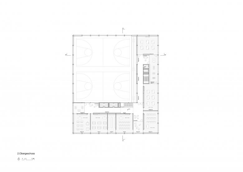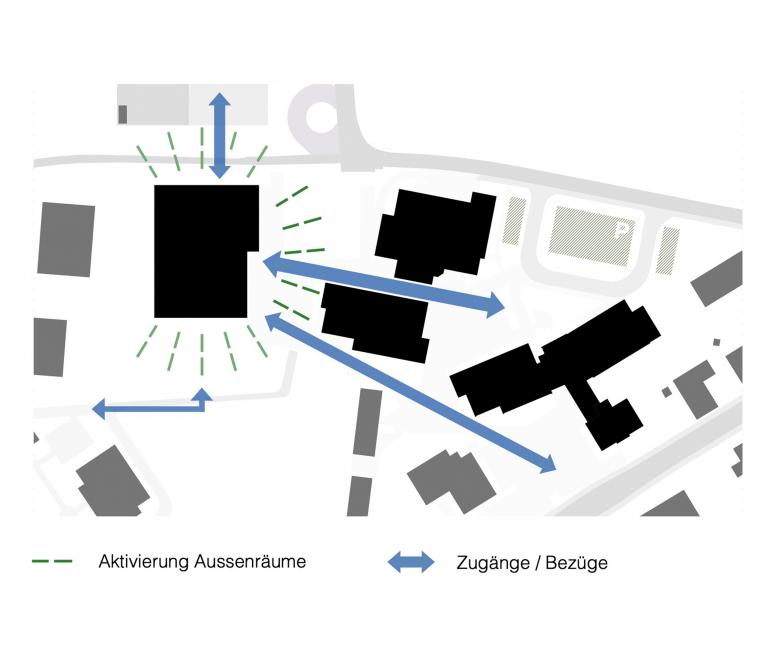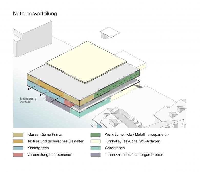 Die präzise Setzung des Gebäudevolumens ermöglicht es, die heterogene städtebauliche Situation zu beruhigen. Der Erweiterungsbau vermittelt zwischen den vorgefundenen städtebaulichen Typologien und fungiert somit als Bindeglied zwischen Schulanlage und Wohnquartier. In der Gesamtstruktur vom Quartier wird der Baukörper mit seiner Erscheinung als öffentlicher Bau wahrgenommen.
