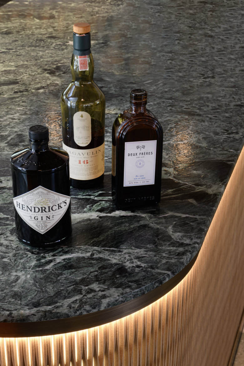 Let's not forget about the stunning green floor crafted from natural stone from the Salvan quarry in Valais. It not only adds a touch of nature to the design but also pays homage to the local surroundings.