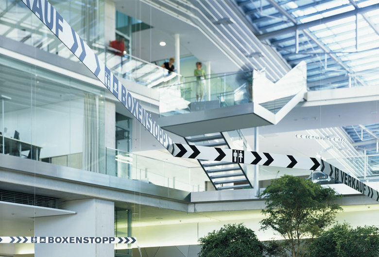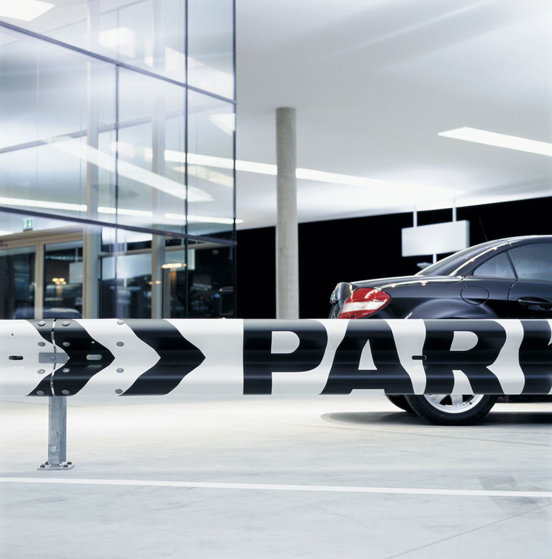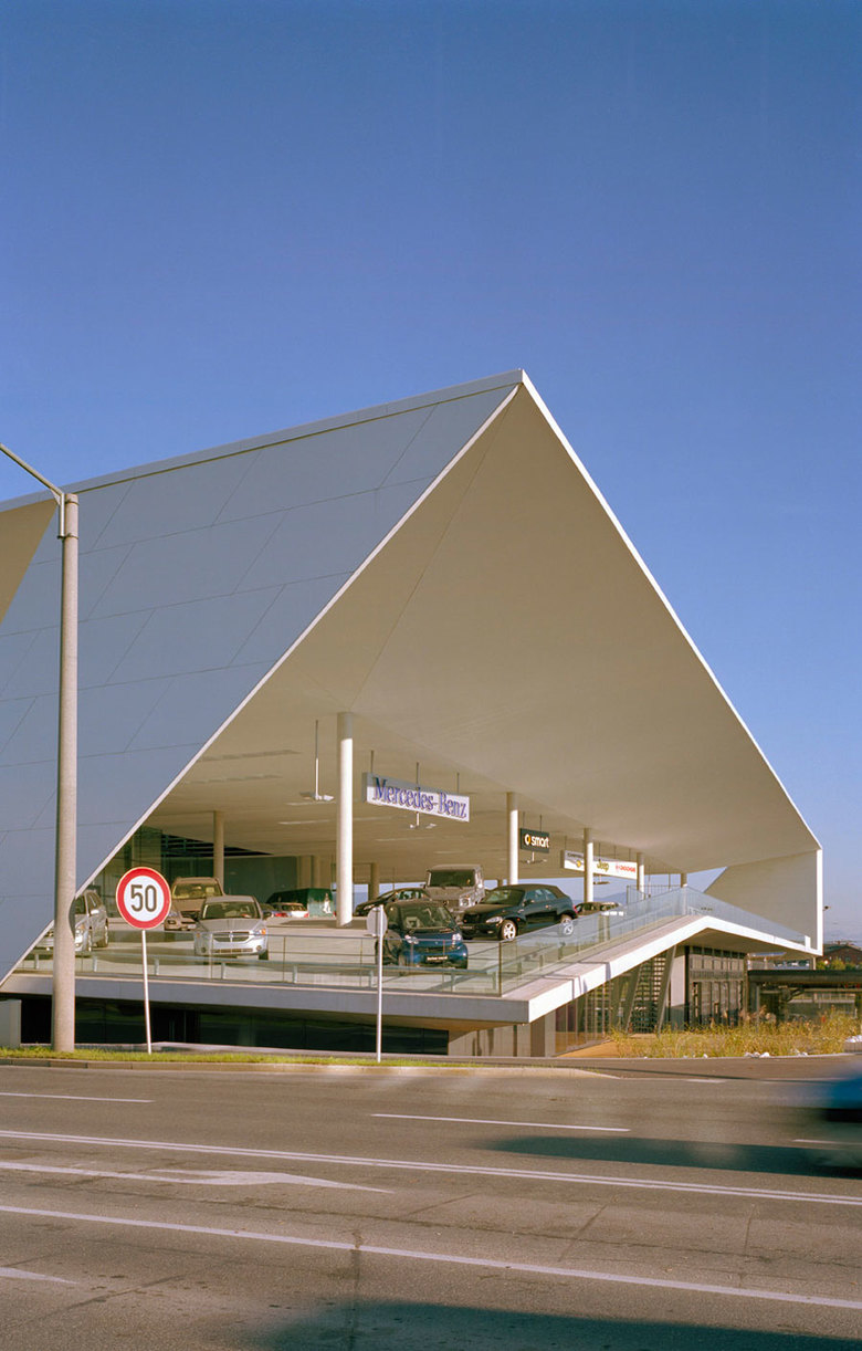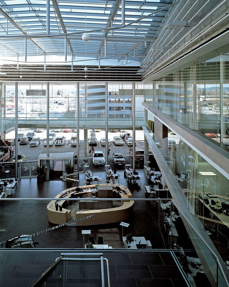 Das Gebäude liegt an einer städtebaulich markanten Einfahrtssituation Salzburgs und wird ausschließlich aus dem vorbeifahrenden Auto wahrgenommen. Die Dynamik und Bewegung des Automobils in das Gebäude hineinzuziehen wird zum konzeptionellen Ansatz. Der Nutzer kann sich im Haus wie auf einer öffentlichen Straße bewegen, durchfahren, parken, aussteigen, umschauen, je nach Bedarf die Autowelt erleben. Alle Nutzungen sind direkt mit dem Auto anfahrbar. Die befahrbare Ebene, das alles überspannende Dach und die Seitenflügel definieren Raum und Erscheinungsform des Verkaufsbereiches, der sich um das glasüberdachte Foyer gruppiert. Die beiden Foyerebenen von Service und Verkauf sind durch eine Rolltreppe komfortabel miteinander verbunden.