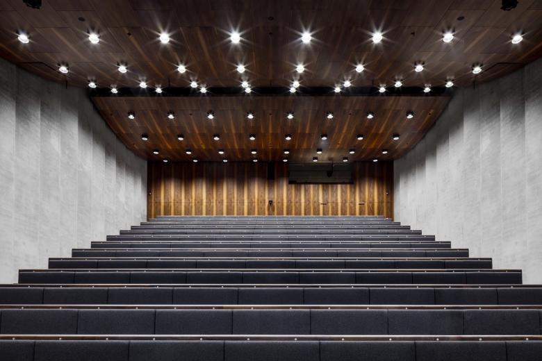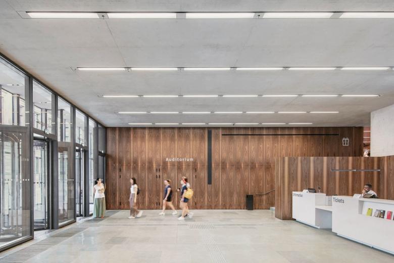Die Innenarchitektur besticht durch minimalistischen Stil mit Sichtbeton-Wänden und hochwertige, edle Materialien wie patinierter Bronze, Thassos-Marmorscheiben und französischem Walnussholz. Auf der Nutzfläche von 4.600 Quadratmetern, verteilt auf drei Geschosse, wird raffiniert mit unterschiedlichen Raumhöhen gespielt, was zu ständig neuem Erleben beim Publikum führt.
