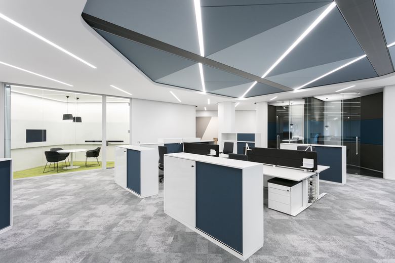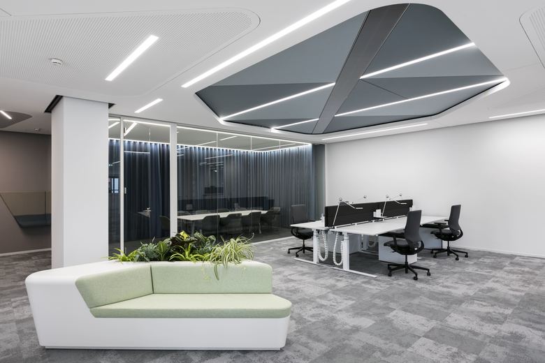 Das Kiefer Kühldeckenpaneel INDUCOOL bildet zusammen mit stoffbespannten Akustiksegeln eine optische und funktionelle Einheit. Die optische Grundstimmung mit zurückhaltenden weißen Flächen wird hier bewusst farblich akzentuiert und die Arbeitsinseln der Großraumbüros spiegeln sich in der zonierten Deckengestaltung wider. Neben der optimalen Raumakustik bieten die teils abklappbaren Akustiksegel eine Revisionierbarkeit dieser Deckenbereiche und einen Zugang zu Regeleinrichtungen. Der nur sehr geringe Deckenbelegungsgrad des Kühldeckenpaneels INDUCOOL von 5 % vereinfacht diese Aufgabenstellung erheblich. Für die Großraumbereiche kann mit einem nur 2-fachen Luftwechsel eine Kühllast von 50 W/m² komfortabel abgedeckt werden.