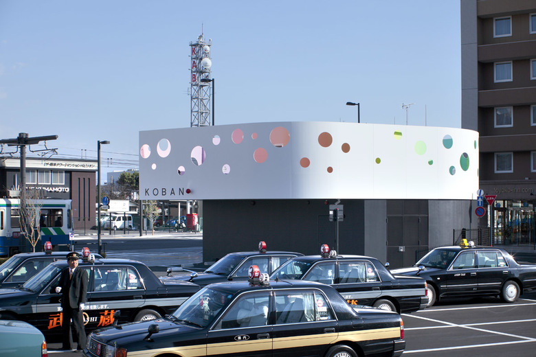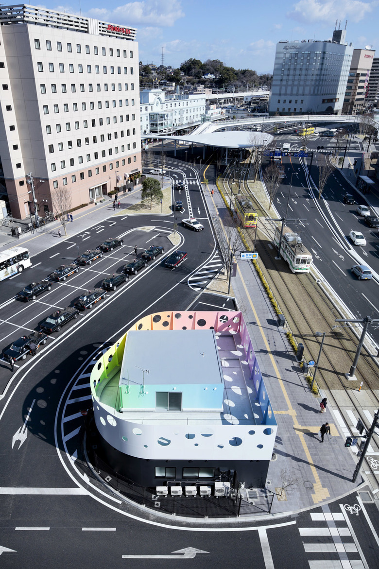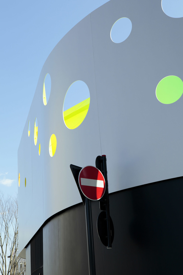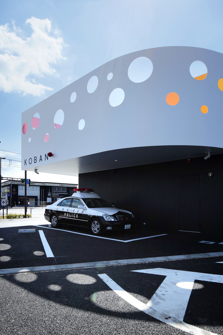 新しい新幹線の駅前に位置するこの交番は、親しみやすく楽しいイメージを持ちながら地域のランドマークとして引き立つ存在である事を求められた。この要求に応えるため、私たちは建物の上部を穴の開いた帯状のスティールで覆い、その中に隠れる上層階と帯の内側に優しい虹色のグラデーションを施すことで彫刻のように独立した表現を与えた。この大胆なグラフィックは周辺全域から目にすることができ、穴から見える内壁の色は見る角度によって変化する。そして帯に開いた穴は交番を囲む道路へ影でできたパターンを描き出す。