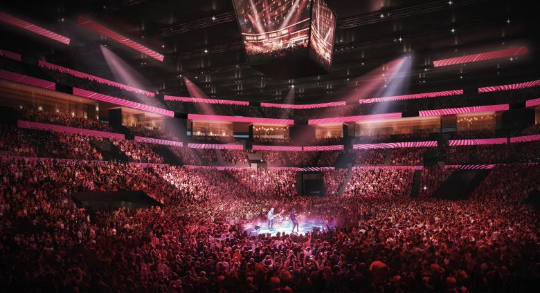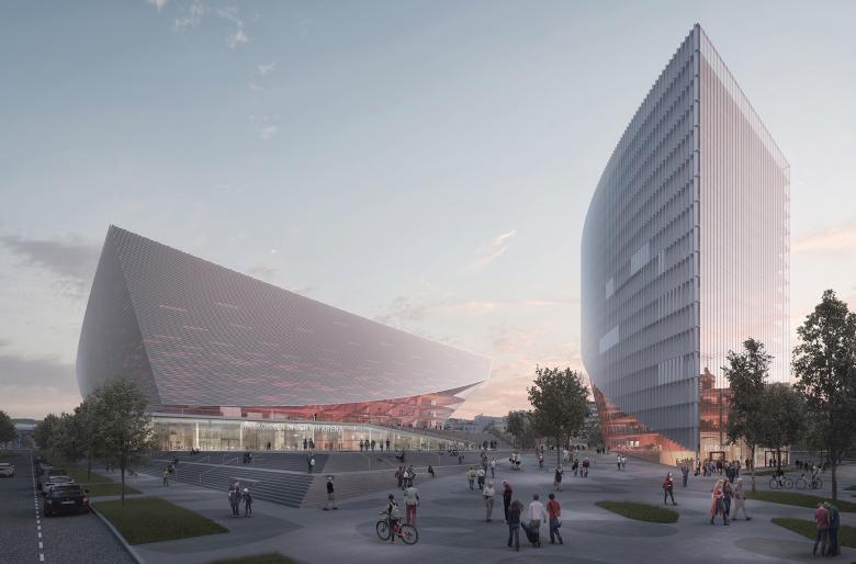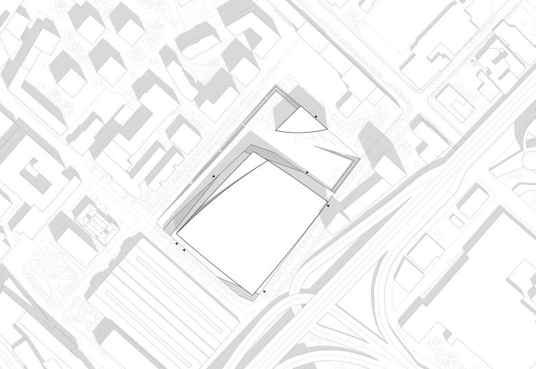 Die Einbindung der Arena an das Leben der Stadt erfolgt über ineinanderfließende Plätze, welche die Topographie des Ortes nutzen. Großzügige Verweilbereiche und Verteilebenen sind über breite Freitreppen und Rampen miteinander verschränkt. Über diesem flächigen Faltwerk der Erschließung balanciert das Volumen der Arena mit weiten Auskragungen über dem umgebenden Freiraum. Die Geometrie des Hochhauses setzt einen präzisen Kontrapunkt zur Halle. Durch den der Halle zugewandten Einschnitt wird der Dialog mit deren weiten Auskragungen aufgenommen. An diesem Punkt verdichtet sich der Platz und erhält urbanes Gepräge.