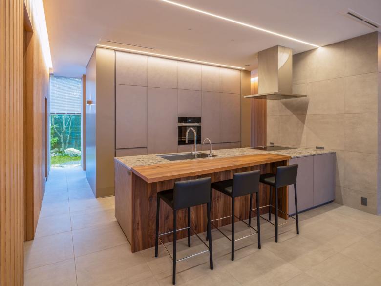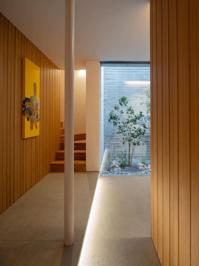 This project is a reinforced concrete structure comprising one basement level and two above-ground storeys. As the site's ground level is 4 metres higher than the front road, access to the building is via the basement.Both the approach and the entrance hall feature a double-height space, creating an open, light-filled atmosphere despite being underground.Upon entering the approach, a timber-clad wall appears. This wall continues upwards, traversing the first-floor living-dining-kitchen area and extending to the stairwell on the second floor.This timber cladding is installed with a distinctive textured pattern, creating varied expressions through the interplay of natural and artificial light. This approach preserves the warmth inherent in the wood while allowing each area to develop its own character, resulting in a richly textured space.