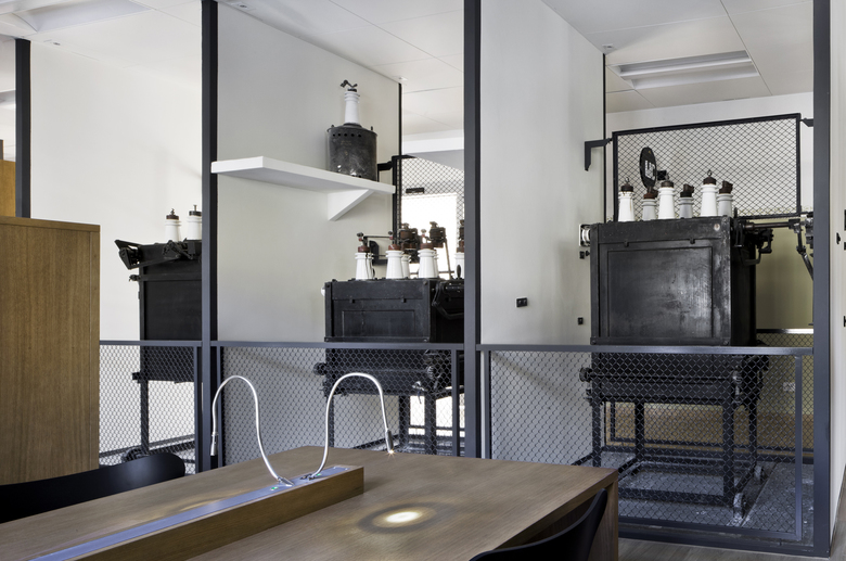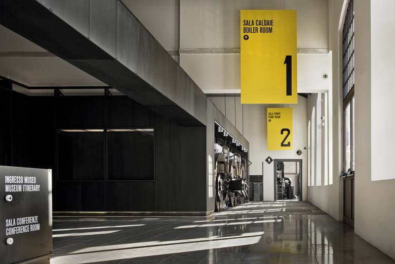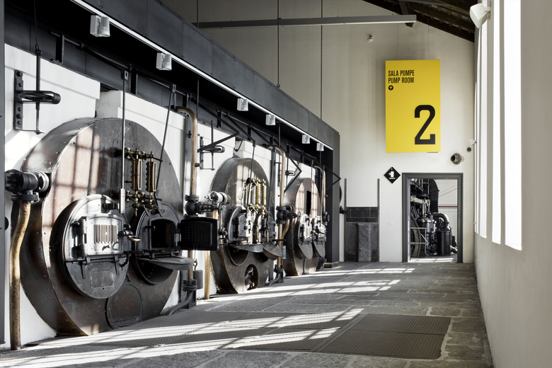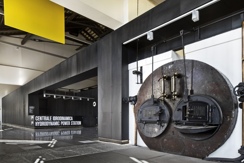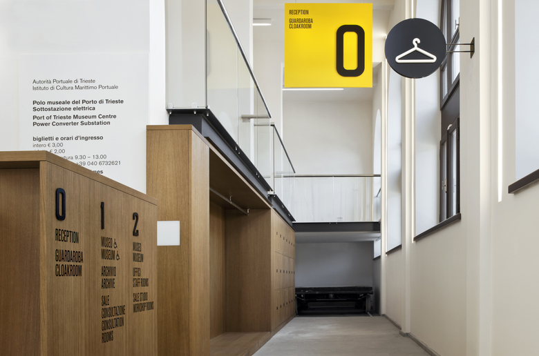 Inside the Old Port of Trieste the Port Authority established the museum center of the port inside two recovered buildings: the Hydrodynamic Power Station and the Power Converter Substation. The exhibition design of the Hydrodynamic Power Station is concentrated in the central area of the building setting a device made of metal frames and infill iron sheets painted. This device, recovering the spatiality original battery of boilers, sets several display case windows in the articulation of the thickness of the walls. Inside the Power Converter Substation a custom-designed fixed furniture in oak, re-proposes some spatial rules in close interaction with the existing elements of the building and the original seriality of the machinery housed therein, re – giving meaning to the spaces.