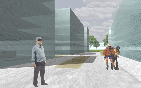 Das gesamte Areal ist frei von Durchgangsstrassen. Das Innere bleibt den Fussgängern und Fahrrädern vorbehalten. Die Erschliessungen sind als Raumfolgen und Raumepisoden mit wechselnder Charakteristik formuliert. Die Strassenräume sind Aufenthalts- und Erlebnisräume und werden dem entsprechend gestaltet. Sie dehnen sich immer von Fassade zu Fassade aus.