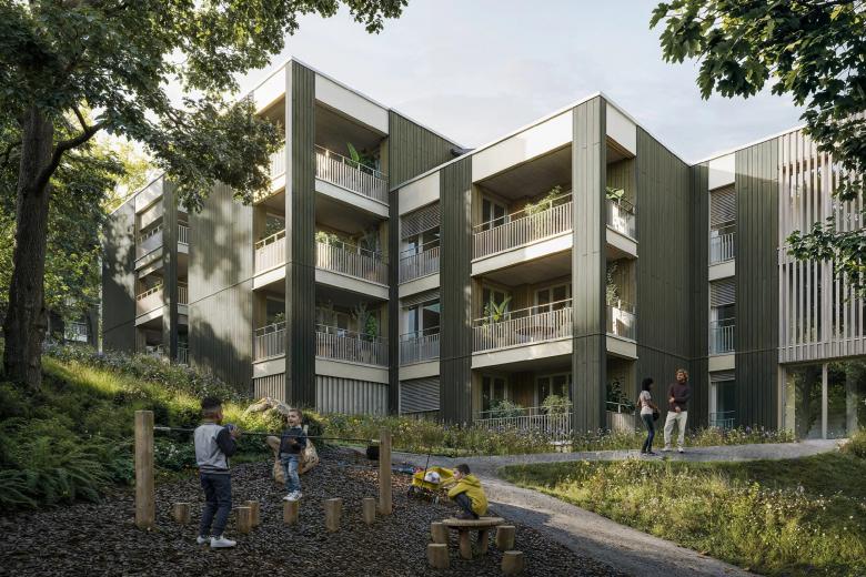 Die Naturräume am Nussbaumerberg sind einzigartig: eine Landschaft am Waldrand – hügelig und grosszügig –, mit einer ganz besonderen Vegetation, in der die Geschichte des ehemaligen Gärtnereiareals Häfelerhau nachklingt. Die langgezogenen Wohnbauten schieben sich zwischen die Ausläufer des Waldes und vermitteln mit ihren grün schimmernden Fassaden als Form- und Farbverwandte zwischen Waldhorizont und heterogen bebautem Dorfrand. Sie formulieren einen ebenso markanten wie fein kalibrierten Auftakt zum Siedlungsgebiet.