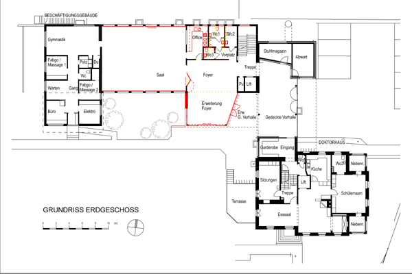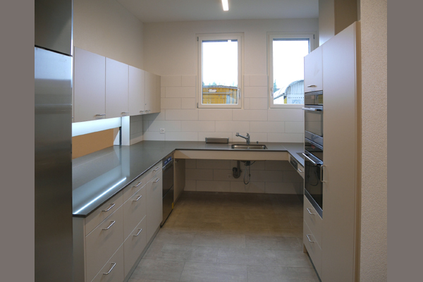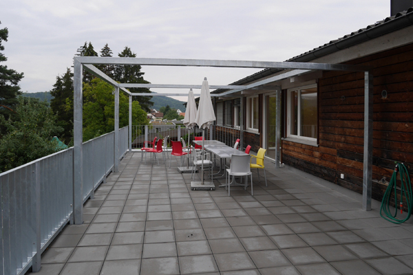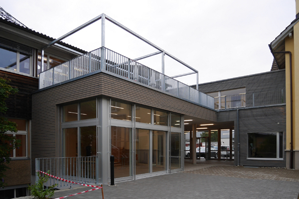 Der ILGENPARK in Ramsen ist ein Wohn- und Beschäftigungsbetrieb für behinderte erwachsene Menschen. Die räumliche Situation im Beschäftigungsgebäude genügte den heutigen Anforderungen nicht mehr. Zudem mussten alle Installationen, die Küche, die Nasszellen sowie die Fenster neu gemacht werden. Um der Platznot gerecht zu werden, wurde ein neues Foyer mit darüber liegender Terrasse erstellt. Der Anbau fügt sich in die bestehende Situation ein und öffnet sich mit einer grossen Fensterfront Richtung Garten. Neben den neuen Einbauten und Installationen wurde das Beschäftigungsgebäude sanft renoviert.