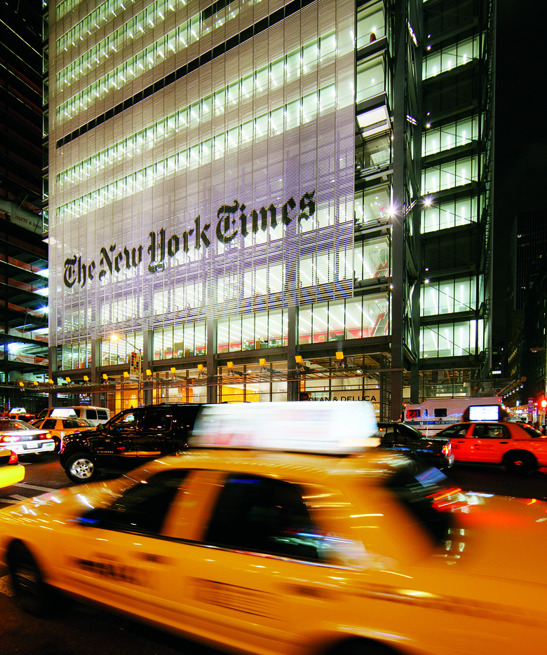 Nighttime lighting reinforces the New York Times Building’s elegance through a precise gradation of light: brightest at the base of the tower and tapering to a soft glow at its summit. Luminaires equipped with state-of-the-art optics were used to stretch illumination across the entire 850’ tall facade. To meet Times Square District requirements for providing an animated façade, select luminaires above pedestrian level are painted “taxi-yellow”—a cultural reference to midtown traffic. Together with the logo graphic, this solution circumvents the usual illuminated billboards and large video screens. In the lobby, lighting highlights the building’s integrated exterior and interior architecture. By controlling illumination levels through the depth of the space, the scheme draws one’s gaze through the interior garden courtyard and into the glass-walled Times Center auditorium space beyond.