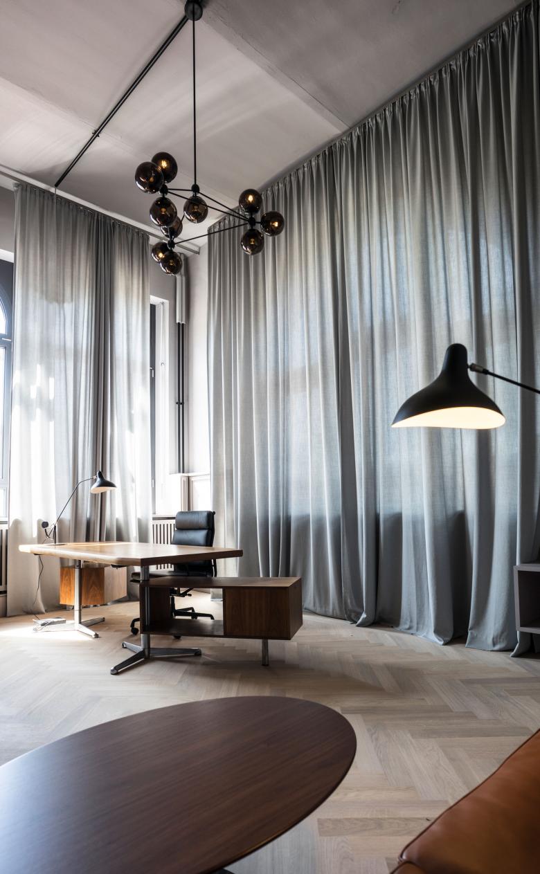 The offices are characterized by timeless classic modernity. Wall surfaces lined with wooden panels interplay with surfaces in muted light blue. The distinguished interior sets a few strong accents. An eyecatcher is the executive desk ‘Boomerang T96 Desk’ from the Italian cabinet maker Osvaldo Borsani, designed in the 1950s. The lighting is directed by elegant chandeliers and the design classic DCW Mantis.