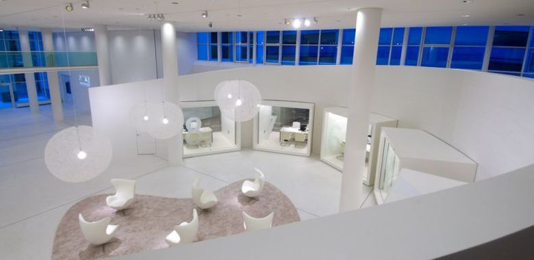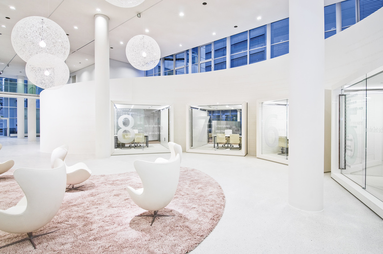 Neugestaltung der alten Eingangshalle zum repräsentativen Kundenforum. Ein dynamischer Wandschwung zentriert das Erdgeschoss zur kreisrunden Piazza.Mittendrin der Kunde, umgeben vom Empfangsbereich und transparenten Beratungskuben, im Verborgenen dahinter das BrokerCenter mit Backoffice. Die Raumstimmung in homogenen Weißtönen unterstützt mit einer klassisch anmutenden Licht – Schatten Wirkung die bewegte Linienführung.