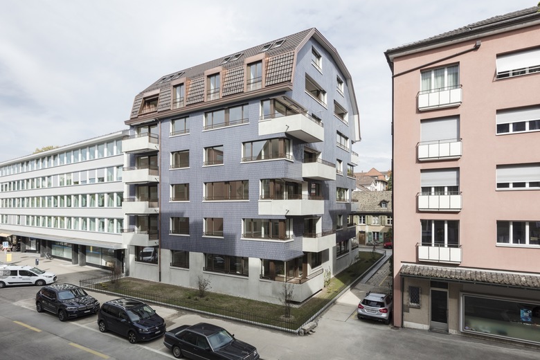 und dem Mansardendach. Die Feinsteinzeugplatten an der Fassade geben dem