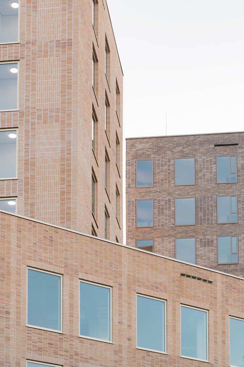 Each building is characterized by a distinct tone within one color family, featuring earthy tones of deep red, soft cream-white and green-grey. The concrete base façades and window frames follow a ton-sur-ton palette, allowing each structure to read as a cohesive sculpture. The façades feature a patches pattern, each with its own brickwork style, window size, and reveal depth. This approach gives the buildings a layered appearance, while still clearly belonging to one architectural family.