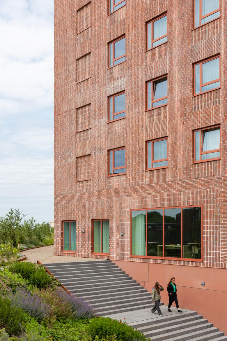 This sustainable vision extends from architecture to materiality and landscape. The façades are built using recycled brick slips from FrontⓇ materials, reducing construction waste by 385,000 kilograms. Each brick is cut into four thin slips, with both the smooth exterior and raw sawn side visible, creating a layered texture. Applied in a variety of brickwork patterns, this adds a ‘mid-scale’ detail to the ensemble. Above the underground parking garage, the park is laid over a retention roof that captures 400,000 liters of rainwater, integrating water management into the architecture and relieving Breda’s infrastructure during heavy rainfall. Energy systems further reinforce this sustainable foundation. A geothermal energy storage system provides heating and cooling for apartments, offices, and the hotel, drawing partly from the ground and partly from outside air. On the rooftops, solar panels generate renewable electricity, supporting the energy supply for shared facilities and strengthening the project’s sustainable infrastructure.
