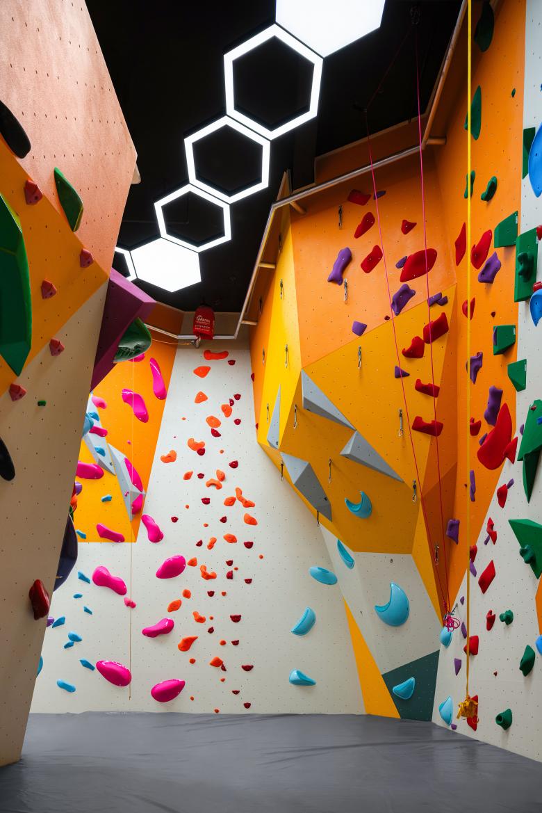 The bouldering walls combine volumes and holds in earthy tones, natural wood, and vibrant orange—natural yet energetic. Custom grips shaped like hearts, numbers, and letters add playful surprises. Overhead, polygonal lighting hovers like invisible routes traced by setters, turning every move into a performance of light and body.