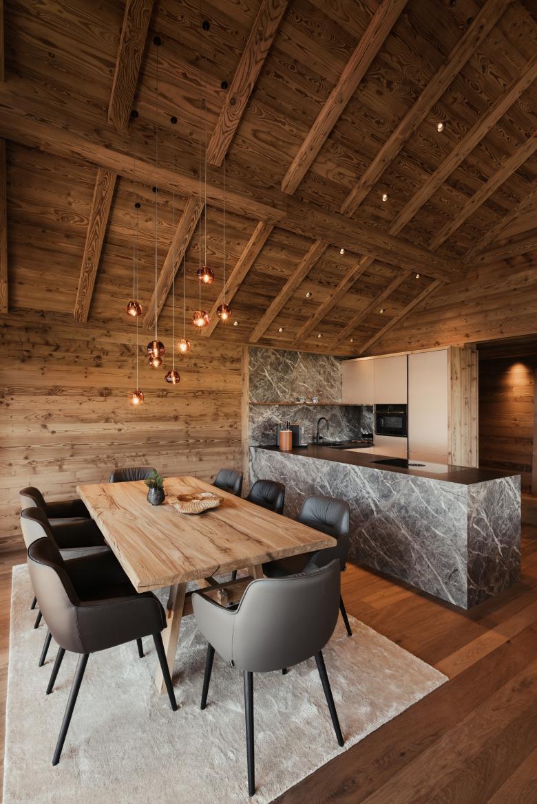 I piani superiori, separati e dotati di tetti a due falde orientati verso sud, richiamano il carattere autentico del maso locale. Il piano terra rivestito in pietra naturale e i due piani superiori in legno rispecchiano l’architettura tradizionale della regione, mentre il design chiaro e angolare offre una reinterpretazione moderna dello stile alpino.