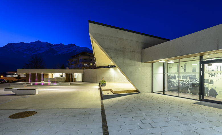 und die historischen Bauten - Kirche und Widum - mit einbezieht. Der neu errichtete Pavillon fungiert dabei als "Rückgrat" des Platzes und schützt vor Schall und Wind gleichermaßen.